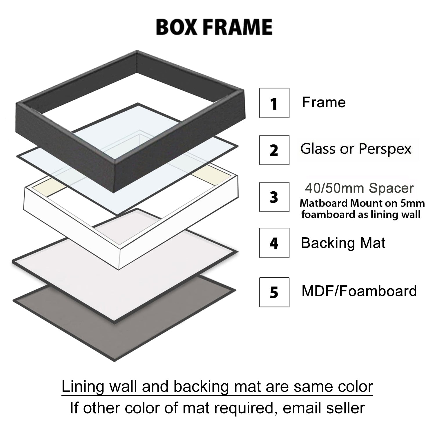 Choose from a range of matboard colours. Each box frame comes with wall lining and backing mat. (Leave a message of your preferred mat color when Checkout)