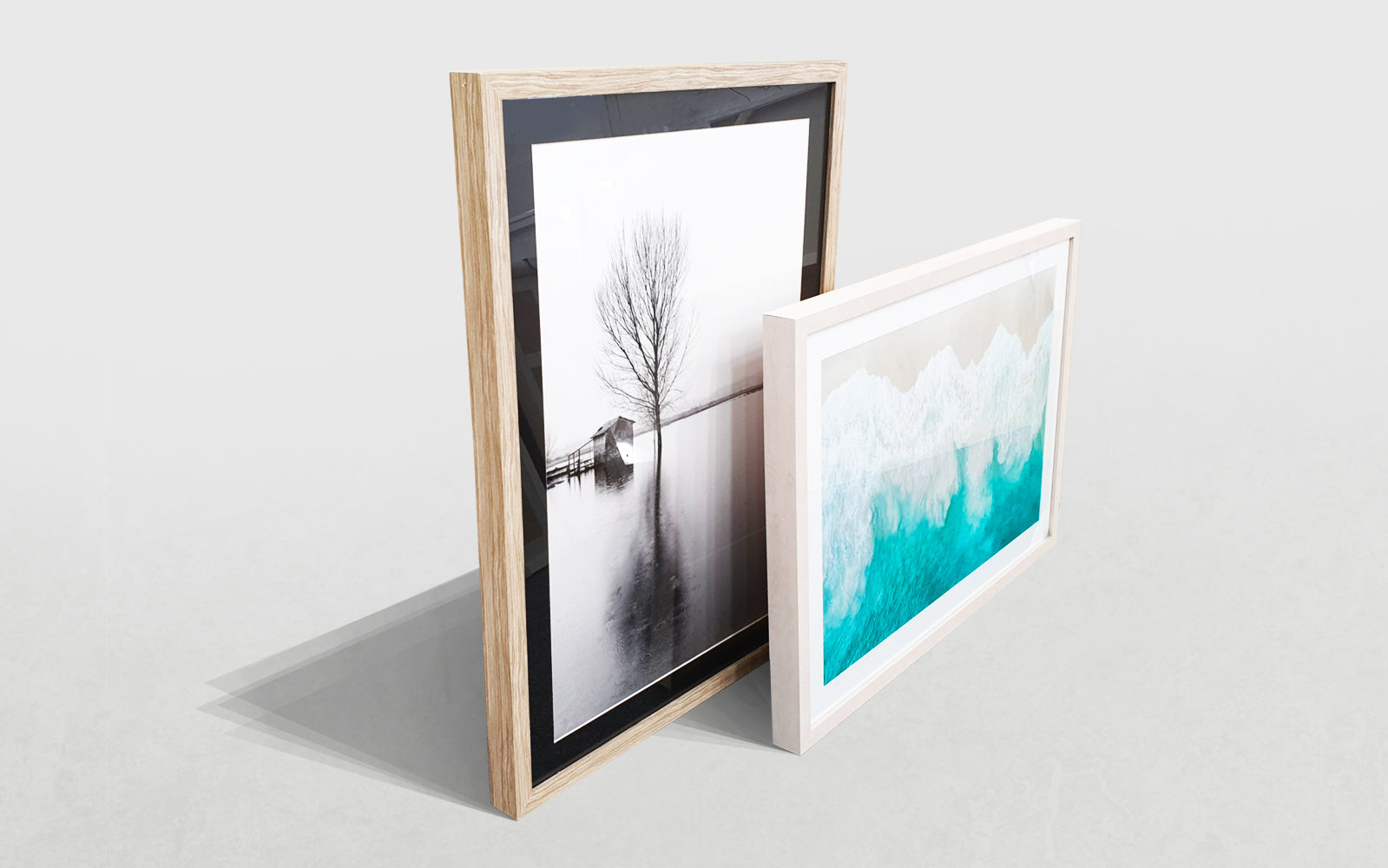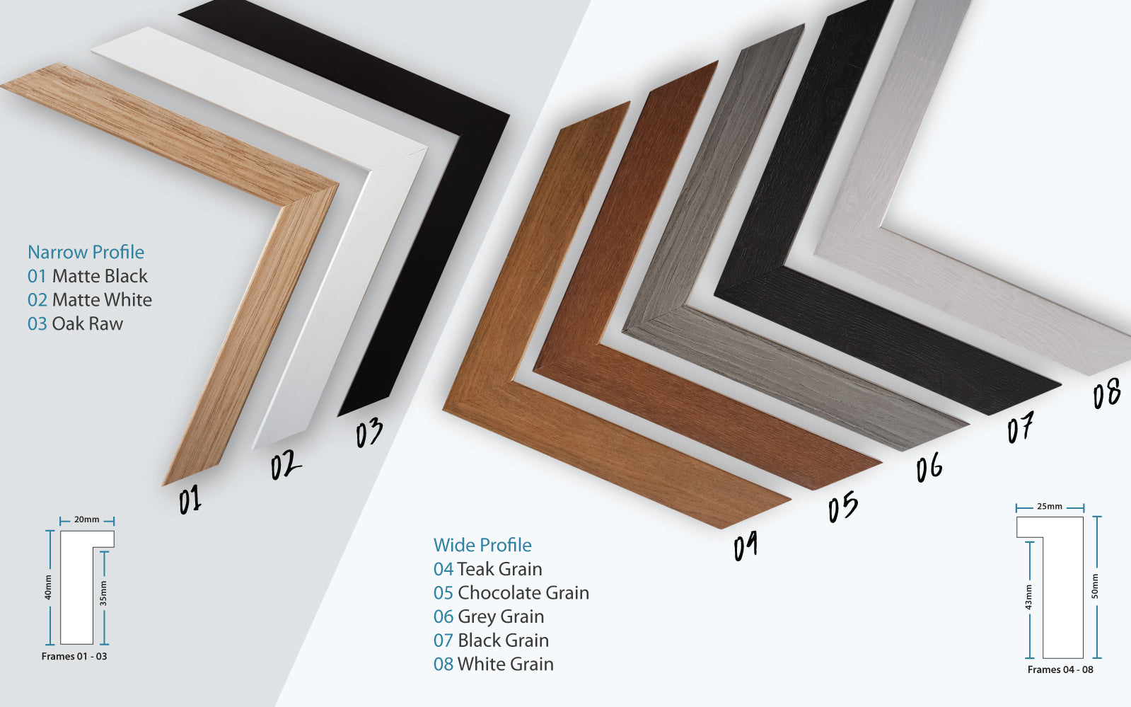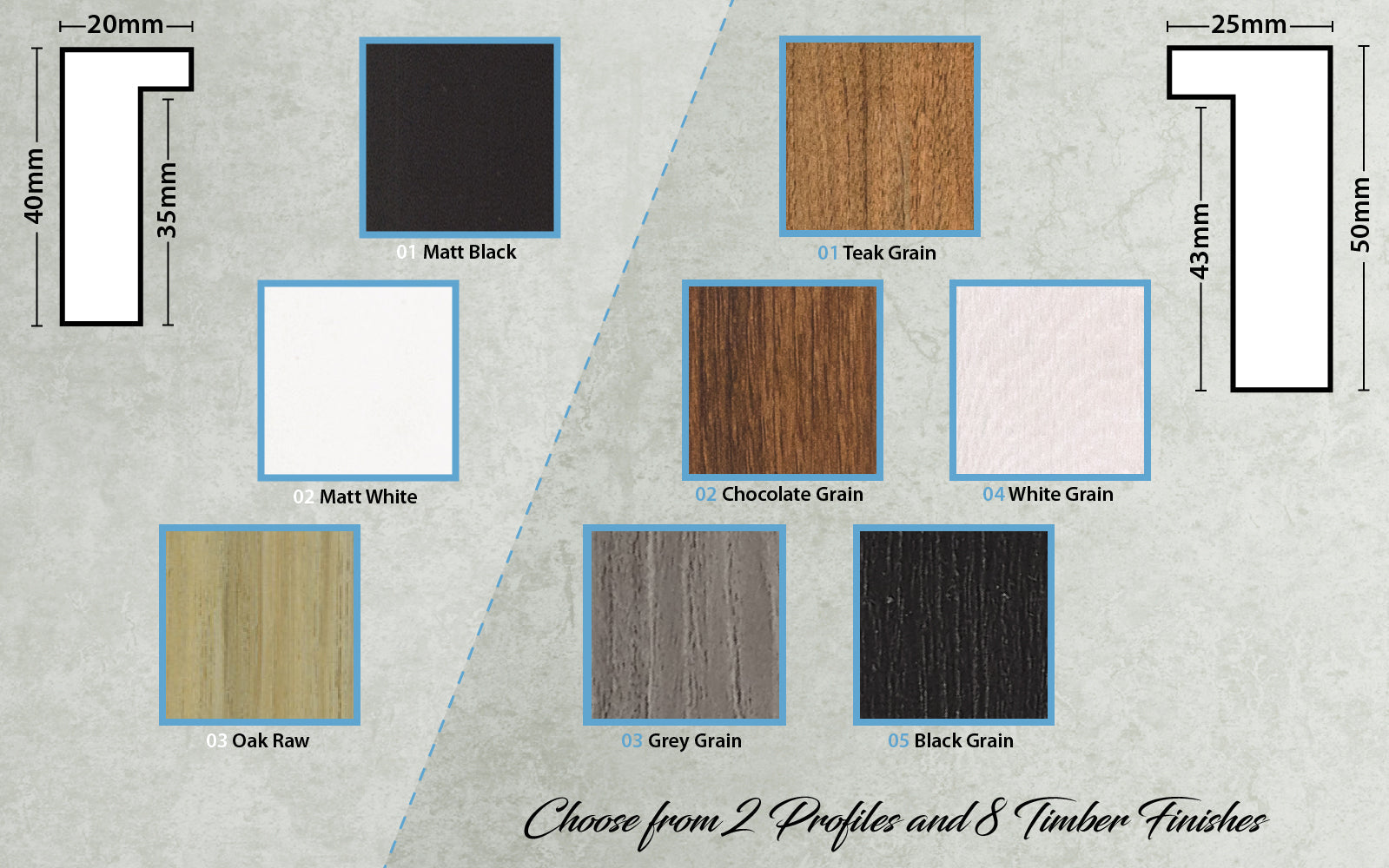 Frame colours are Black grained, White grained, Teak grained, Chocolate grained, Grey grained, Matt white, Matt black and Natural Oak.