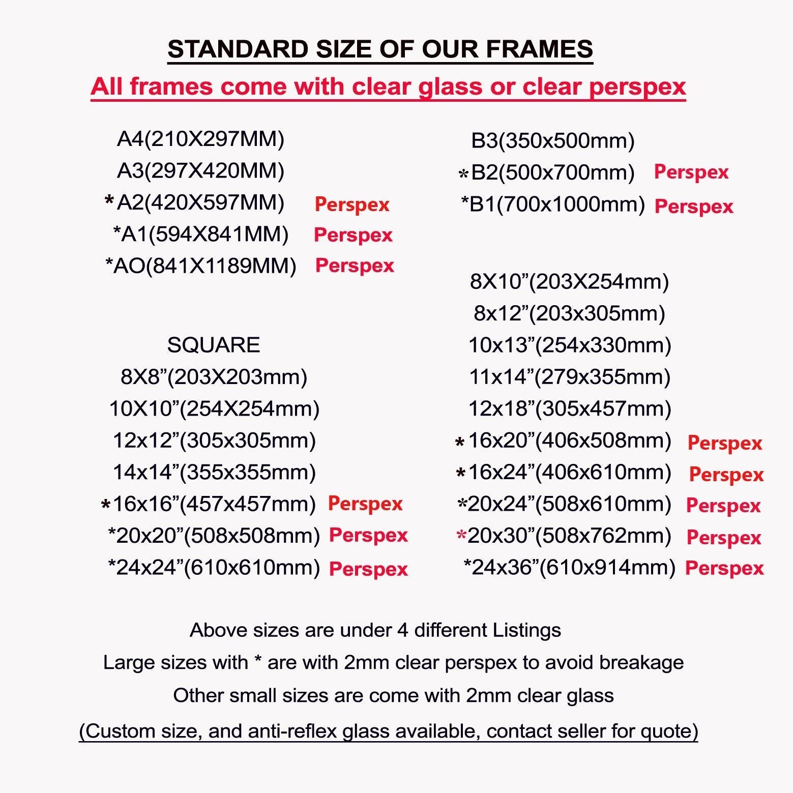 These extra large frames come with 2mm Perspex in place of clear glass, to avoid breakage during transit. 5mm foam core backing and hanging kit included.